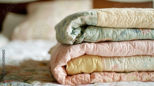 Neatly folded quilts in pastel colors stack on a bed, infusing the room with a sense of homeliness and comfort.