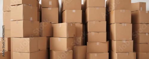 Neatly stacked brown cardboard boxes on white , order, reuse, photography