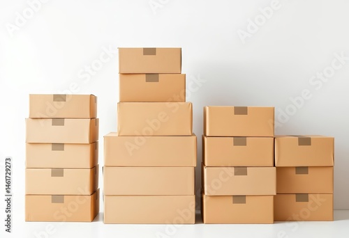 Neatly stacked cardboard boxes against a pure white backdrop, warehouse, recyclable