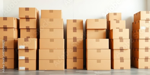Neatly stacked cardboard boxes, ample empty space, logistics, management
