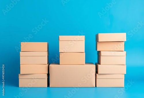Neatly stacked cardboard boxes on a blue background, marketing, clean background