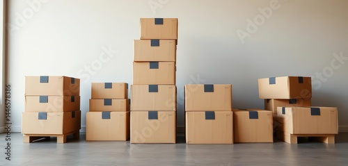 Neatly stacked cardboard boxes on a flat surface, ample empty space, design, composition