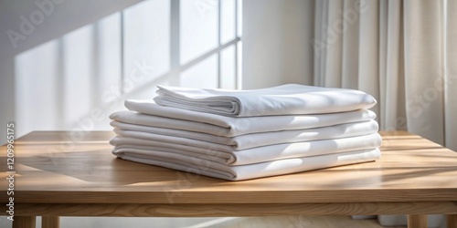 Neatly stacked, freshly laundered white bedding rests on a light wood surface, bathed in soft sunlight