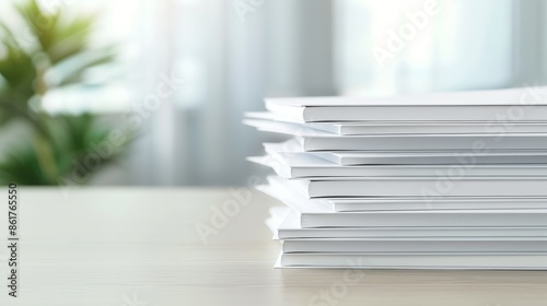 Neatly stacked pile of crisp white papers, perfectly aligned on a sleek wooden desk, soft sunlight filtering through a nearby window, creating a serene workspace atmosphere