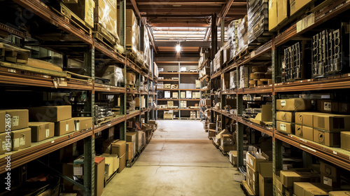 Neatly stacked shelves in a warehouse, showcasing efficient organization and professional storage solutions.