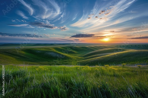 Nebraska Landscape. Sandhills Sunset with Windmill and Blue Sky