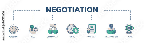 Negotiation icons process structure web banner illustration of skills, communicate, tactic, contract, and goal icon live stroke and easy to edit