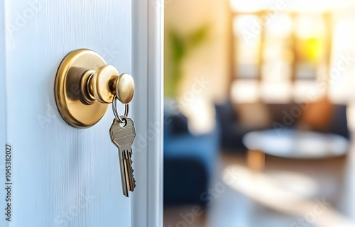 Neighbourhood Real Estate - A key hanging in a door knob, hinting at entry to a cozy, well-lit interior space.