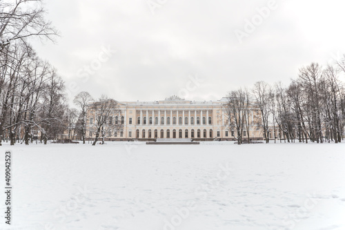 Neoclassical building in the park in winter.