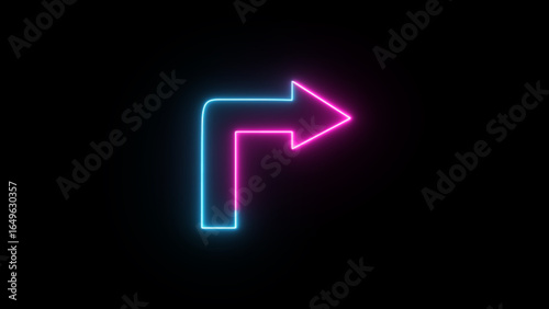 neon arrow sign, glowing with both blue and pink light, and indicating a right turn