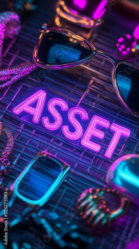 Neon Asset: A vibrant neon sign spelling "ASSET" glows against a backdrop of sleek accessories, creating a visually captivating and trendy image.