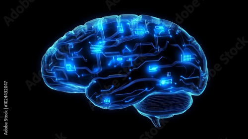 Neon blue brain with circuit patterns, symbolizing artificial intelligence and technology.