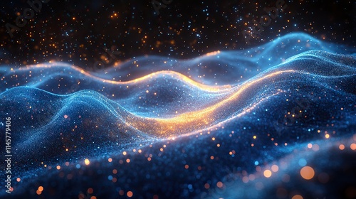 Neon blue illustrations of waves and particles represent connection, futuristic technology, digital transformation, big data, electricity, energy, programming software, and cloud computing.