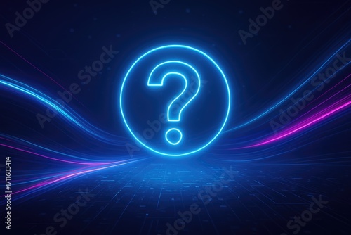 Neon Blue Question Mark in Circle with Abstract Light Trails on Digital Grid Floor symbol