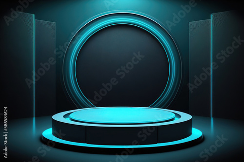 Neon blue sci-fi round product podium display, empty clean showcase with copy space. AI generative image.