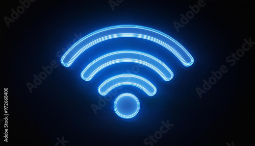 Neon blue wi-fi symbol on dark background. Internet communication and technology concept.