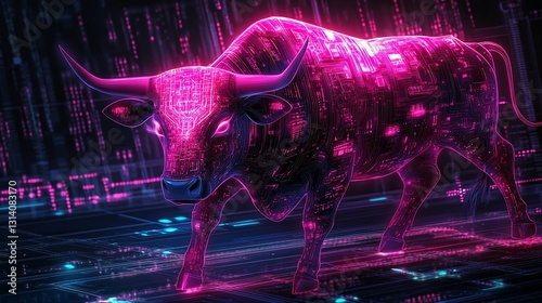 Neon bull charging through digital matrix backdrop