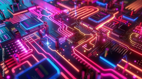 Neon Circuitry: 3D Rendering of High-Tech Chip Architecture in Vibrant Hues
