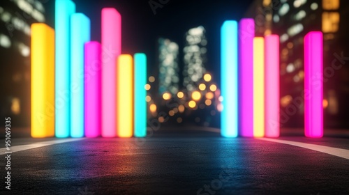 neon cityscape nighttime street with colorful glowing lights for technology background or futuristic design.