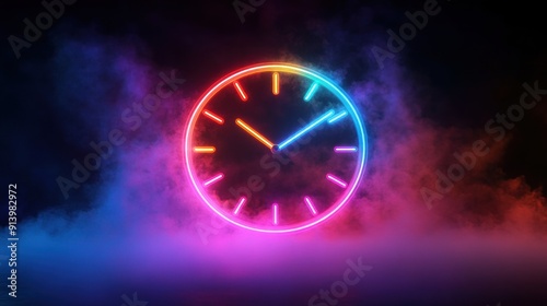 Neon clock glowing with vibrant colors against foggy backdrop showcasing time management, modern style, colorful and artistic display