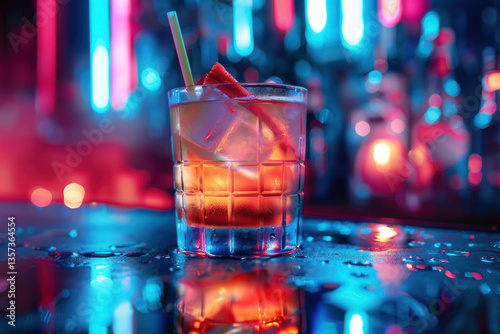 Neon cocktail with glowing liquid layers, futuristic bar setting
