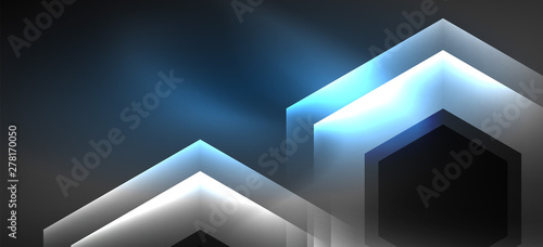 Neon color hexagon shapes, lines on black background. Modern template for web backdrop design. Abstract geometric frame