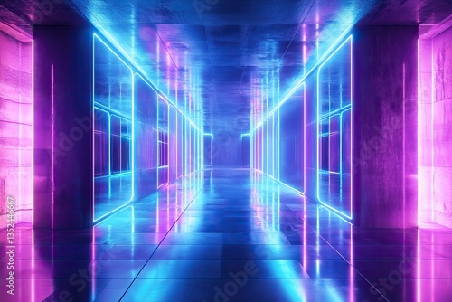 Neon corridor with reflective surfaces and vibrant light. Possible use design, architecture, technology