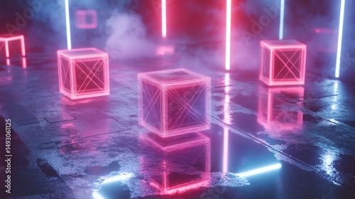 Neon cubes in a futuristic, reflective space