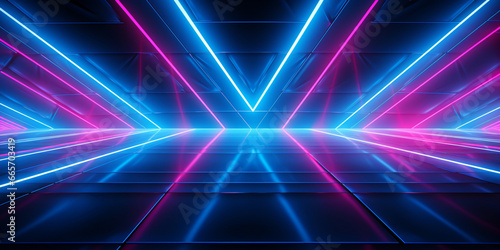 Neon dark stage shows empty room: neon light, spotlights, dark blue, purple, pink background - dance floor for product display in studio, backdrop for photo shooting. Generative AI