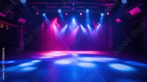 Neon Dark Stage Shows Empty Room with Spotlights, Neon Lights, and Dark Blue, Purple, Pink Background