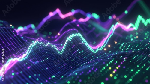 Neon Data Stream Glowing Charts on Digital Landscape.