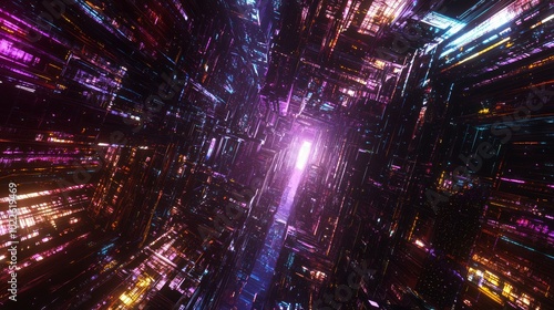 Neon Dreamscape: Surreal 3D Cityscape with Merge of Skyscrapers, Digital Designs, and Vibrant Lights in Night Atmosphere