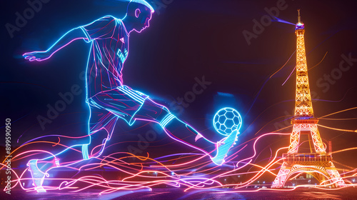 Neon Footballer: Bright neon lines forming a footballer kicking a ball with the Eiffel Tower in the background on a dark grey background.