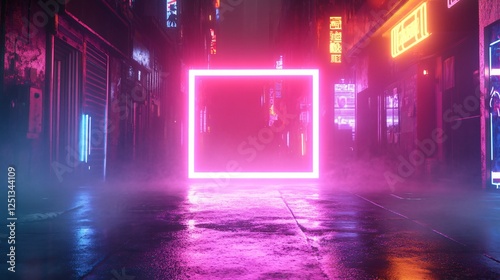 Neon Frame with Square Pink and Orange Lights, Dark Urban Alley, and Futuristic Storefronts. Copy space. Generative AI