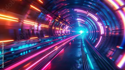 Neon futuristic tunnel with dynamic lighting, perspective view. Sci-fi and cyberpunk concept