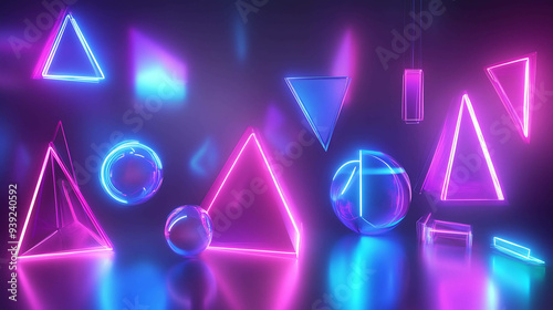 Neon geometric shapes float in a dark room, casting bright glowing reflections.