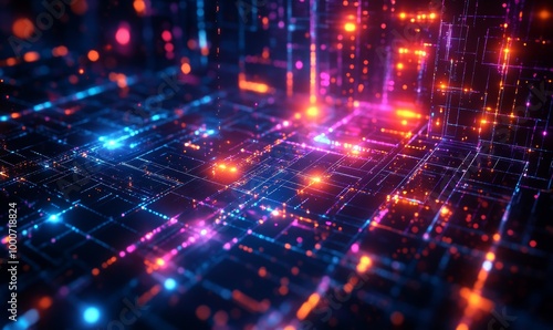 Neon Geometric Structures in Cyberspace: Colorful Abstract Illustration with Lights Against Dark Background for Futuristic Tech and Digital Art Themes, Generative AI