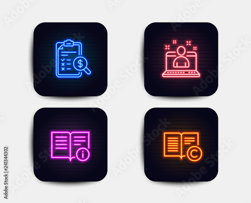 Neon glow lights. Set of Best manager, Accounting report and Technical info icons. Copyright sign. Best developer, Check finance, Documentation. Copywriting book. Neon icons. Glowing light banners