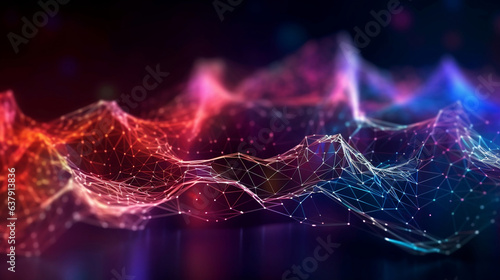 Neon glow low poly in red green and blue, digital and neural network concept futuristic technology abstract landscape background.