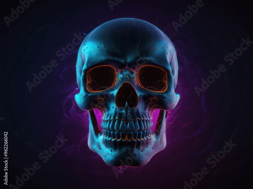 Neon glowing skull in a dark, surreal digital art piece