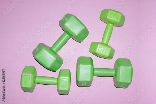 Neon green dumbbells on a pink backgournd with hard direct flashlight