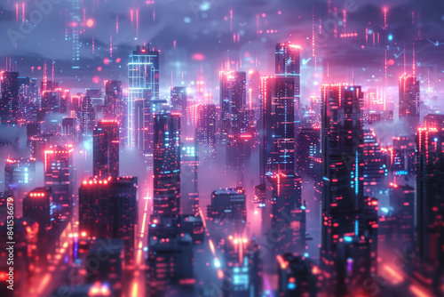 Neon gridscape with a futuristic city and dynamic, geometric designs,