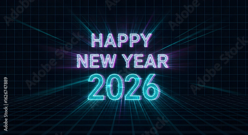 Neon Happy New Year 2026 Glowing Retro Background