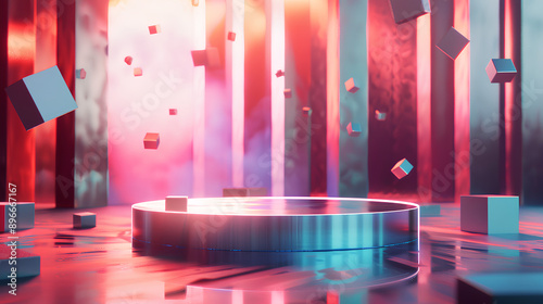 Neon Illuminated Metallic Podium in Futuristic Setting