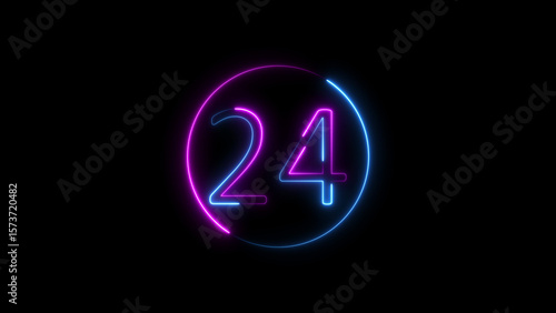 Neon illustration of the number twenty-four in a glowing circle on black background