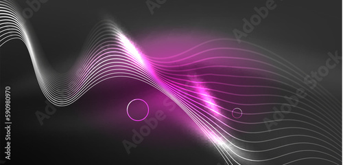 Neon laser lines, circles waves abstract background. Neon light or laser show, electric impulse, power lines, techno quantum energy impulse, magic glowing dynamic lines
