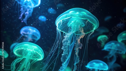 neon life form design Glowing jellyfish float gracefully in dark waters, creating a mesmerizing underwater scene.