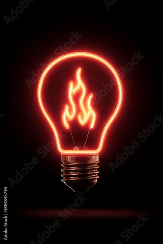 Neon light bulb with flame design glowing against a dark background, symbolizing creativity