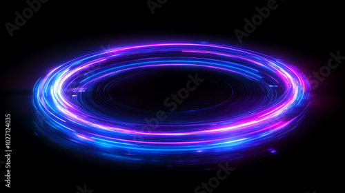 Neon light rings in futuristic circular flow, holographic digital design, abstract swirling energy, glowing blue and purple light, high-tech sci-fi visual for modern cyber environment