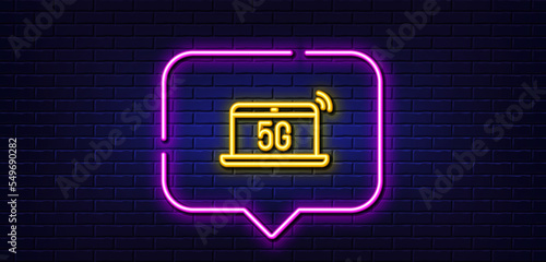 Neon light speech bubble. 5g notebook line icon. Wireless technology sign. Mobile wifi internet symbol. Neon light background. 5g notebook glow line. Brick wall banner. Vector